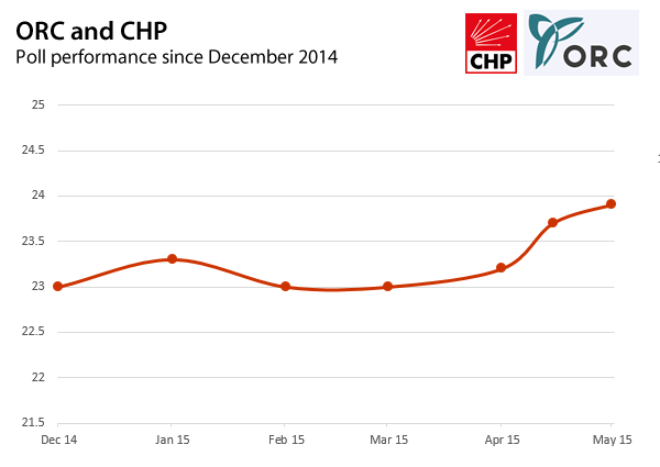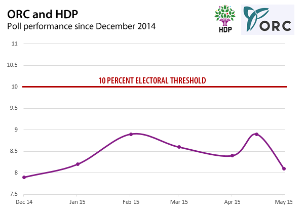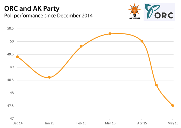 The numbers are fairly typical of ORC, whose polls always find a high share in AK Party support. But this is also the lowest vote share ORC has given AK and the highest it has given the CHP since October 2014. What’s more, the MHP hasn’t fared so well in an ORC survey since last September.